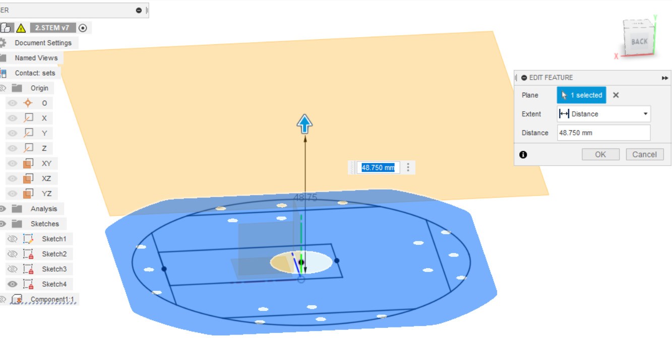 - Рабочую плоскость оформляем с помощью инструмента Offset Plane, параллельно нижней детали с отступом 48.75 от эскиза (из пункта 1).