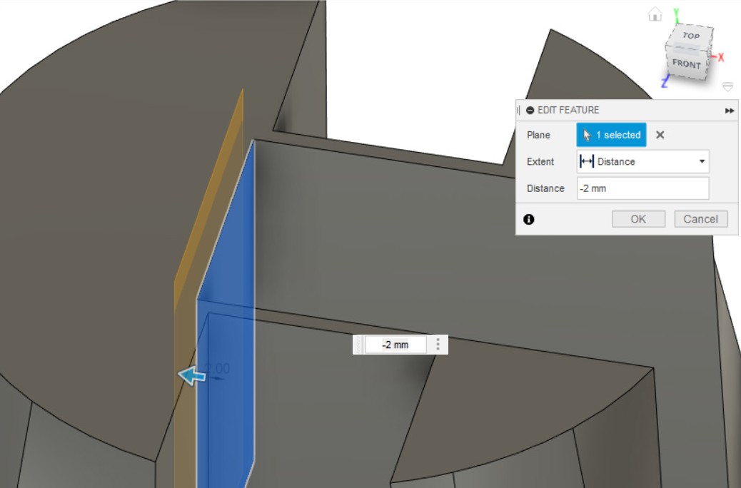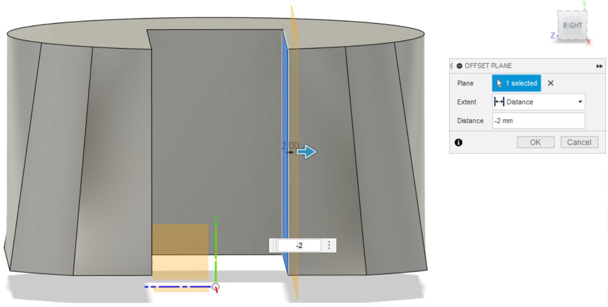 - Создаём параллельную плоскость, с помощью инструмента Offset Plane, от внутренней плоскости со сдвигом на 2 мм.