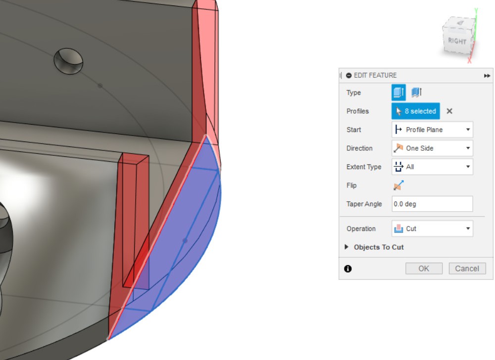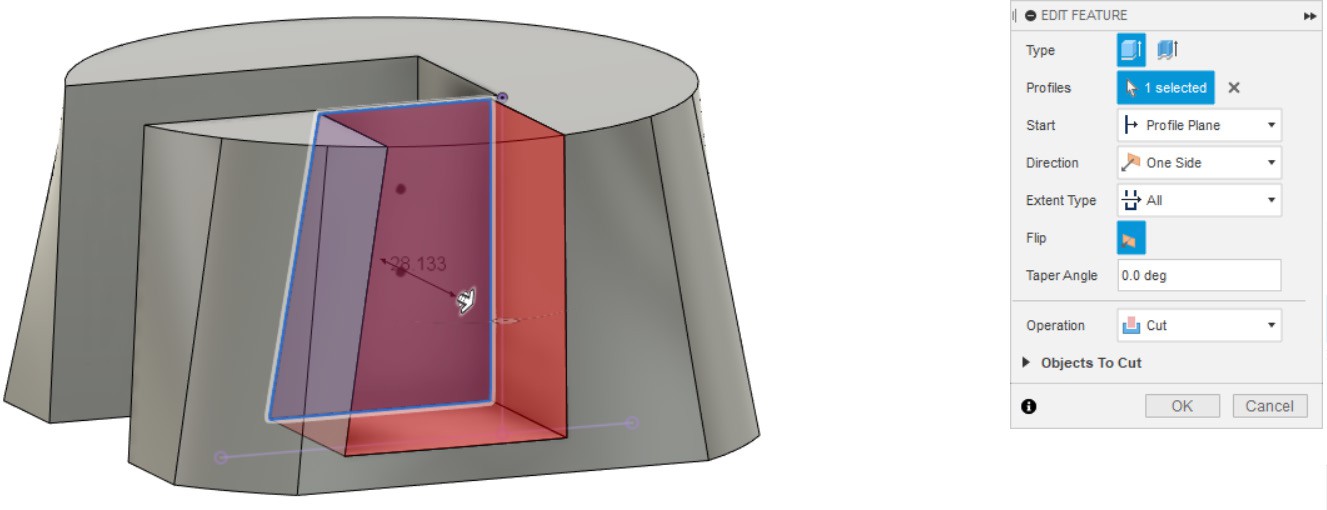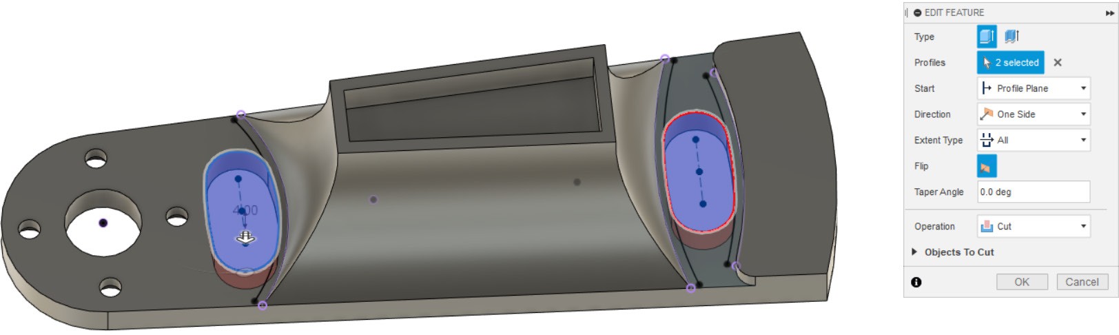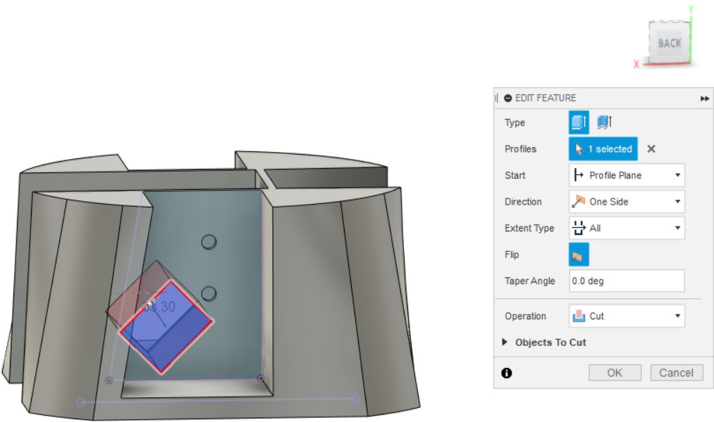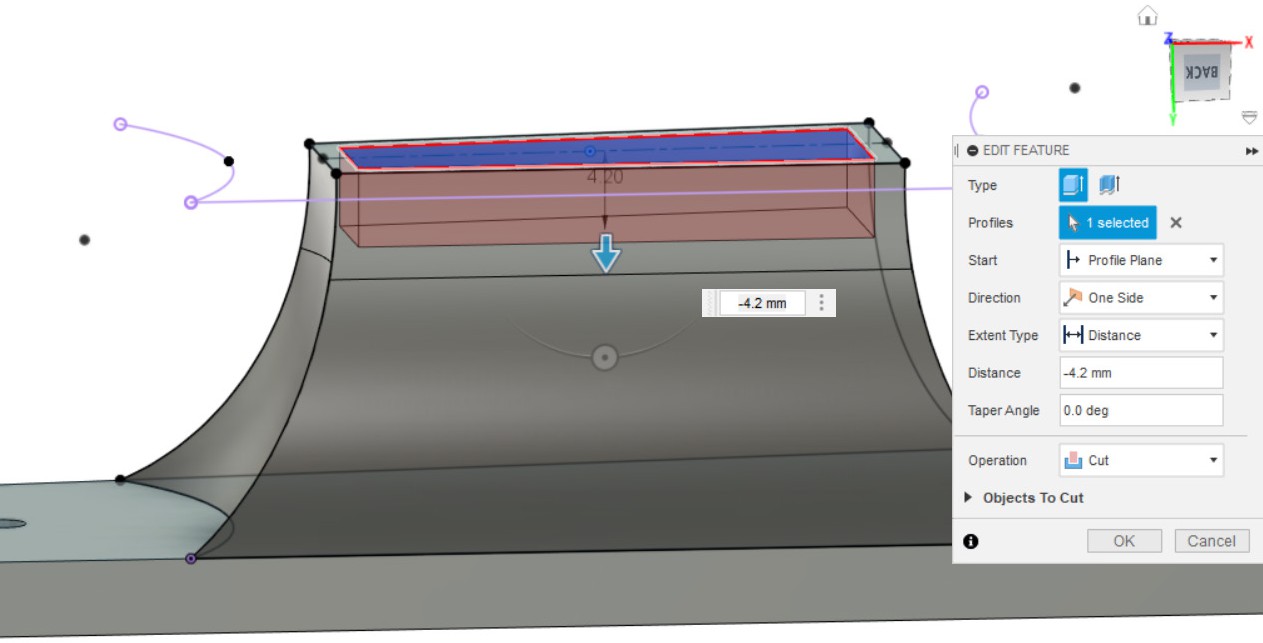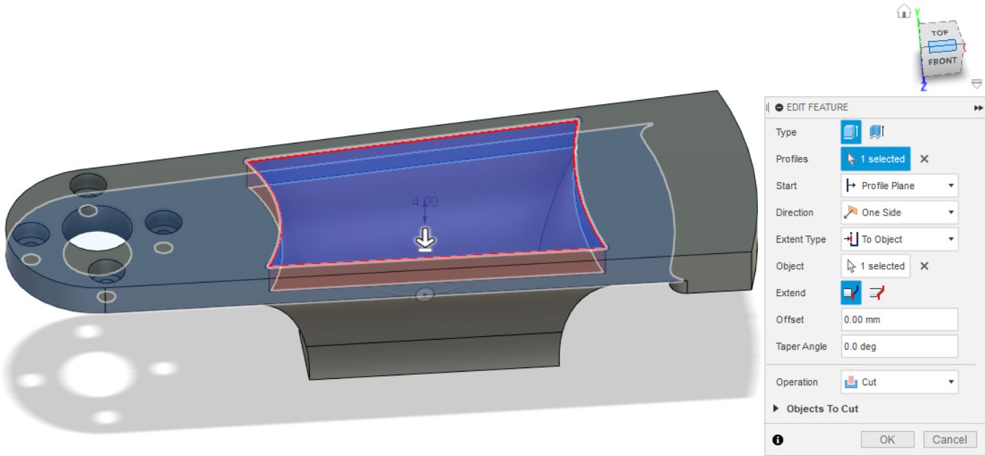 - Выдавливаем замкнутый контур эскиза насквозь, чтобы получилось углубление в детали.