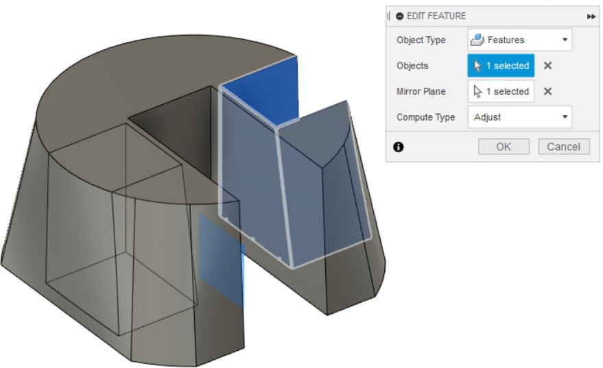 - Делаем зеркальное отражение выдавливания (пункт 7), выбрав в качестве Mirror Plane основную плоскость, параллельную внутренним стенкам детали.