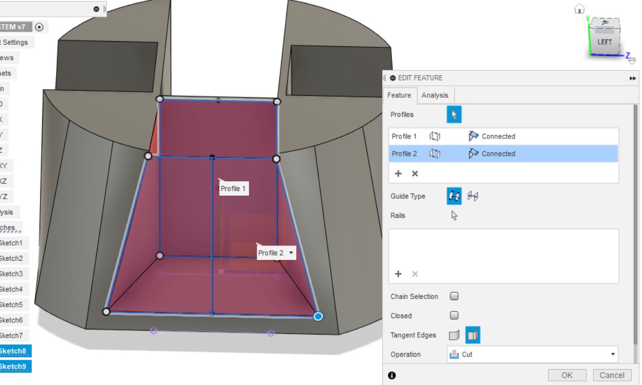 - Делаем LOFT, выбрав эскизы (из пунктов 10 и 12).