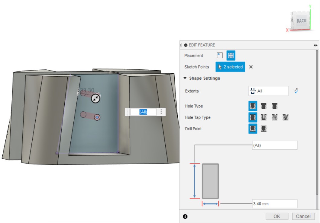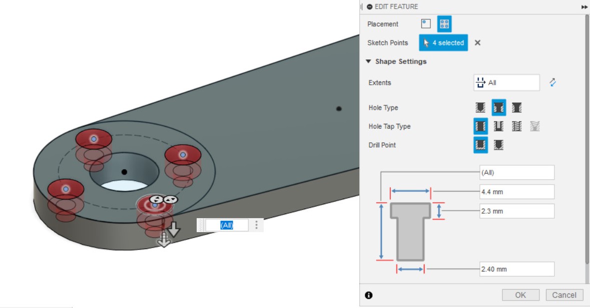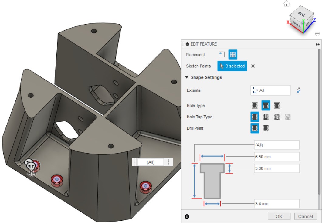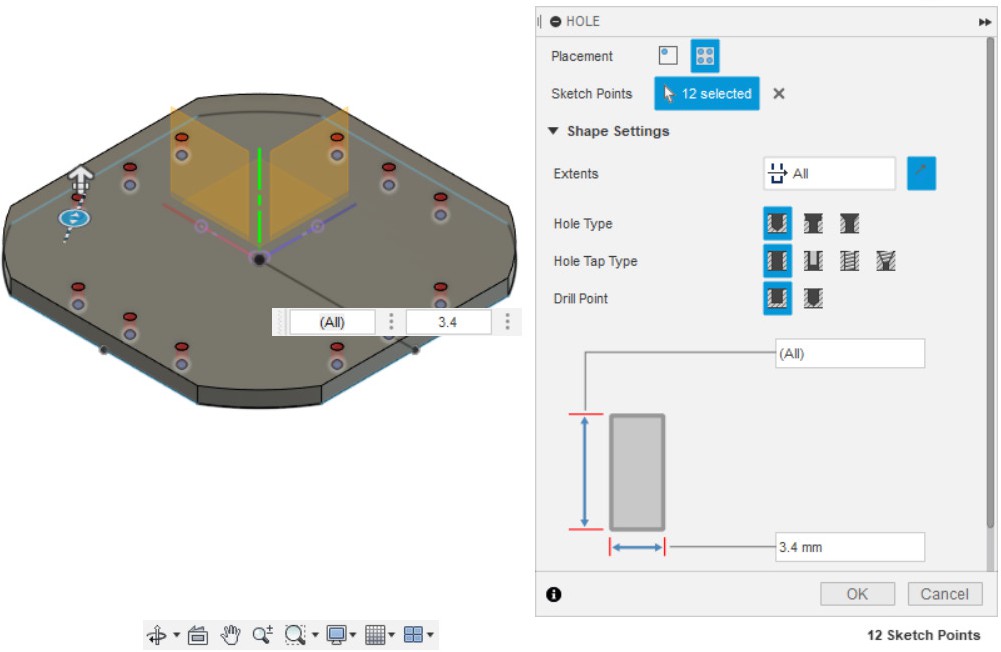 - Делаем отверстия 3.4 мм (Hole) (используем эскиз из п.1).