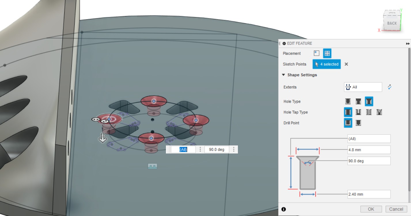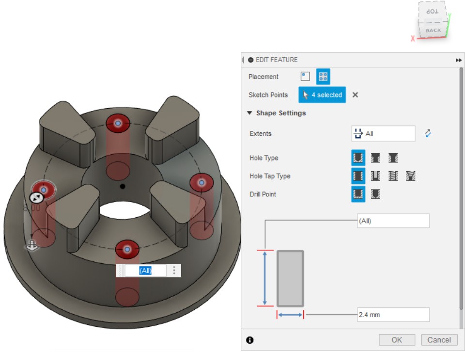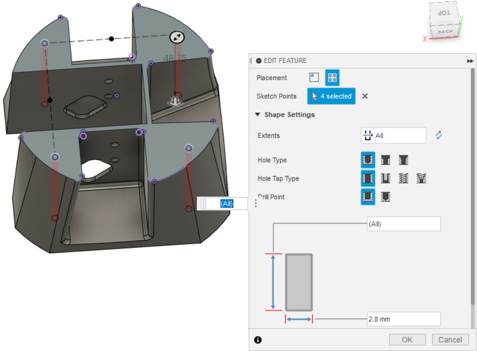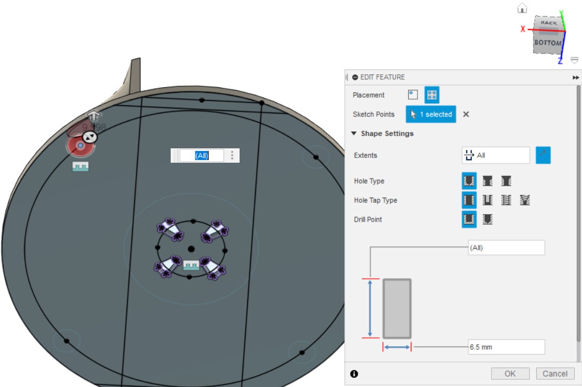 - Создаём отверстия по точкам из эскиза, созданного в пункте 23.