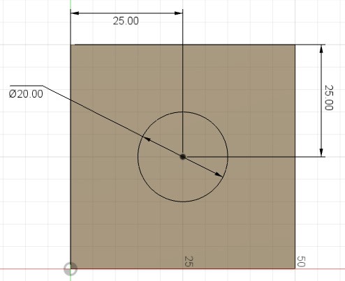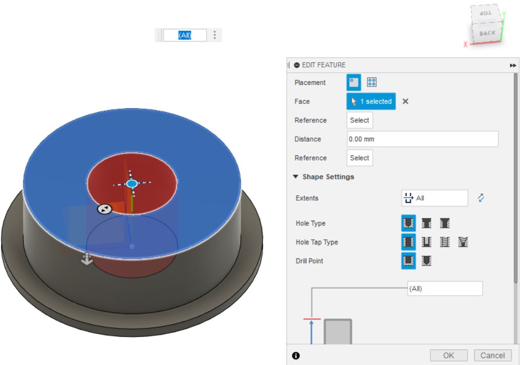- Делаем отверстие по центру детали, выбрав сначала плоскость для отверстия, потом окружность, в центре которой нужно сделать отверстие.