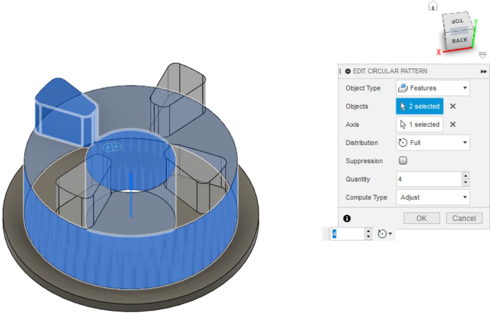 - Создаём круговой массив из выдавливания и скругления (пункты 8 и 7), выбрав в качестве оси вращения ось Y.