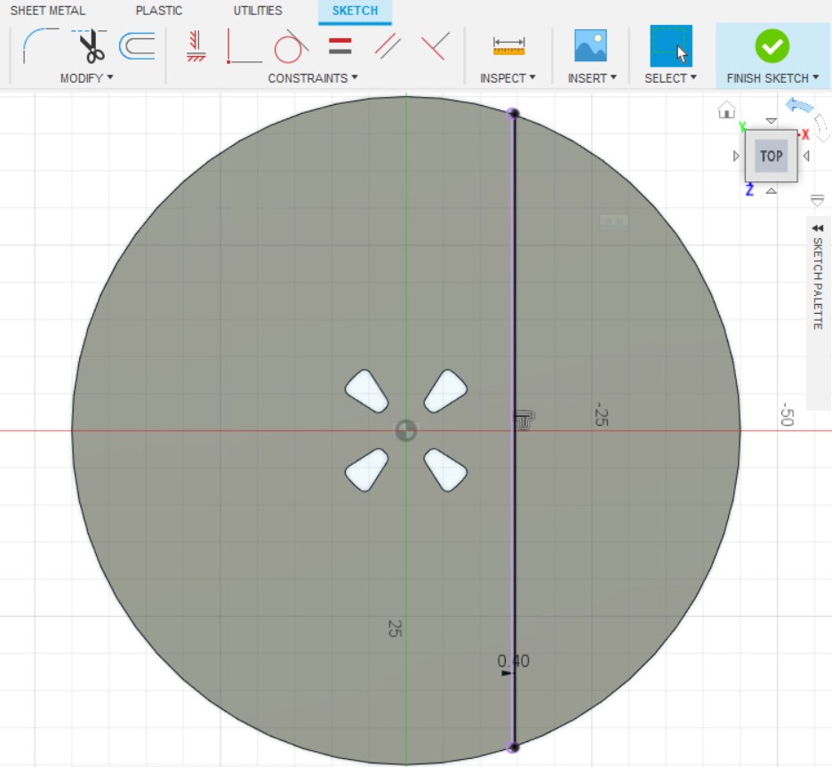 - Создаём эскиз на верхней плоскости детали, с проецированием геометрии от прошлого эскиза (пункт 1) и инструментом «Смещение» сдвигаем линию вправо на 0.4 мм.