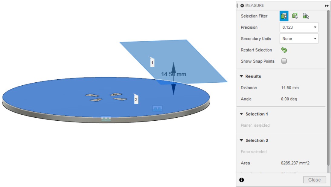 - Создаём рабочую плоскость, на расстоянии 14.5 мм от верхней плоскости детали.