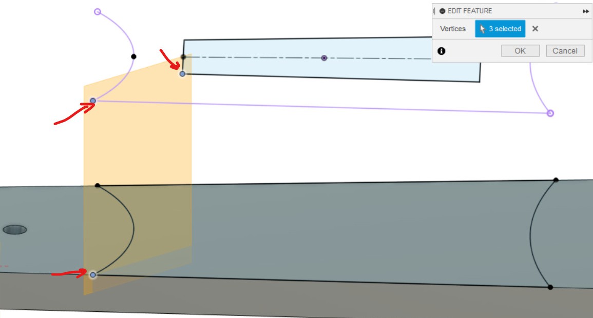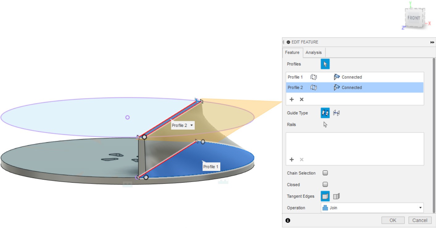 - Делаем LOFT, выбрав замкнутые контуры из первого и второго эскиза, как показано на картинке.