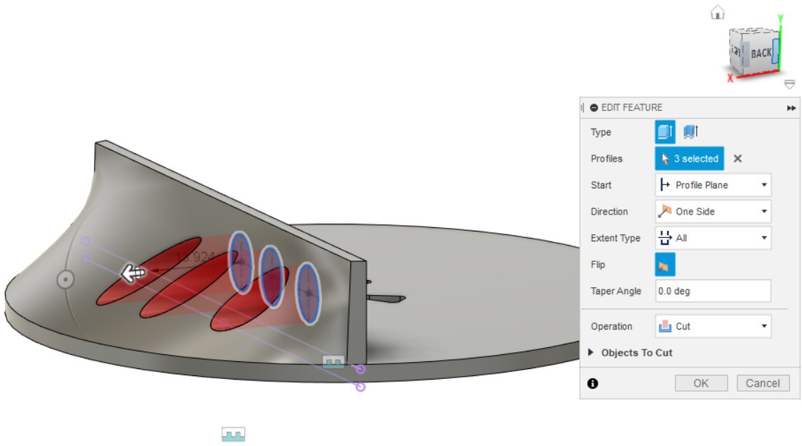 - Создаём отверстия по центру эллипсов из эскиза, созданного в пункте 8.