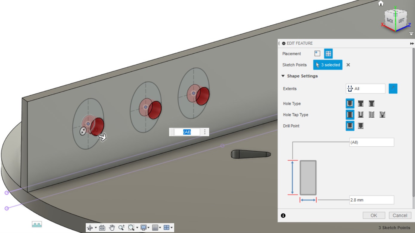 - Делаем отверстия по точкам из эскиза (из пункта 10).