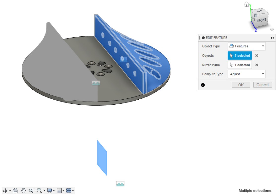 - При помощи инструмента Mirror создаем зеркальное отражение отверстий (из пункта 22), выбрав в качестве Mirror Plane основную плоскость, параллельную внутренним стенкам детали.