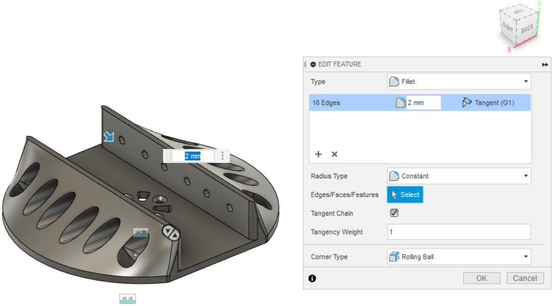 - Создаём скругление в 2мм, как показано на рисунке: