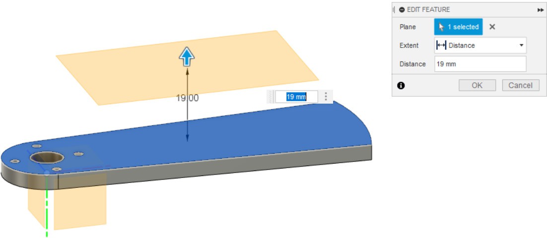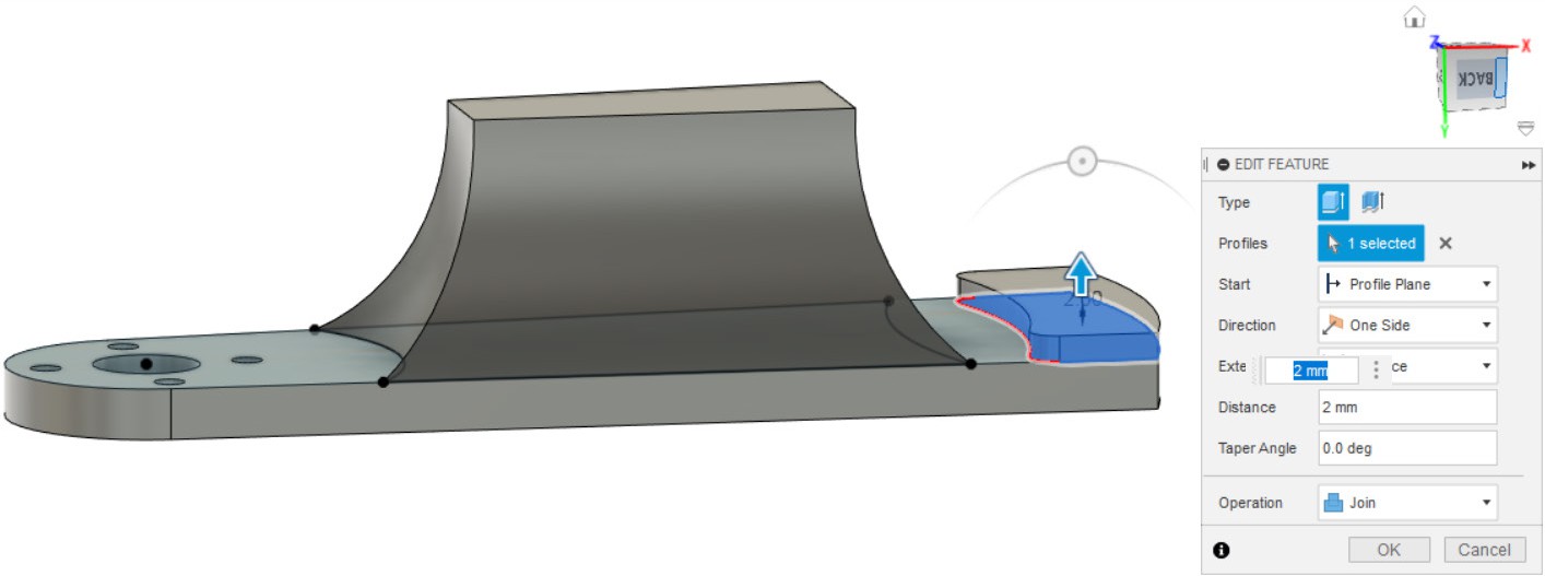 - Вытягиваем часть от первого эскиза детали, как показано на картинке.