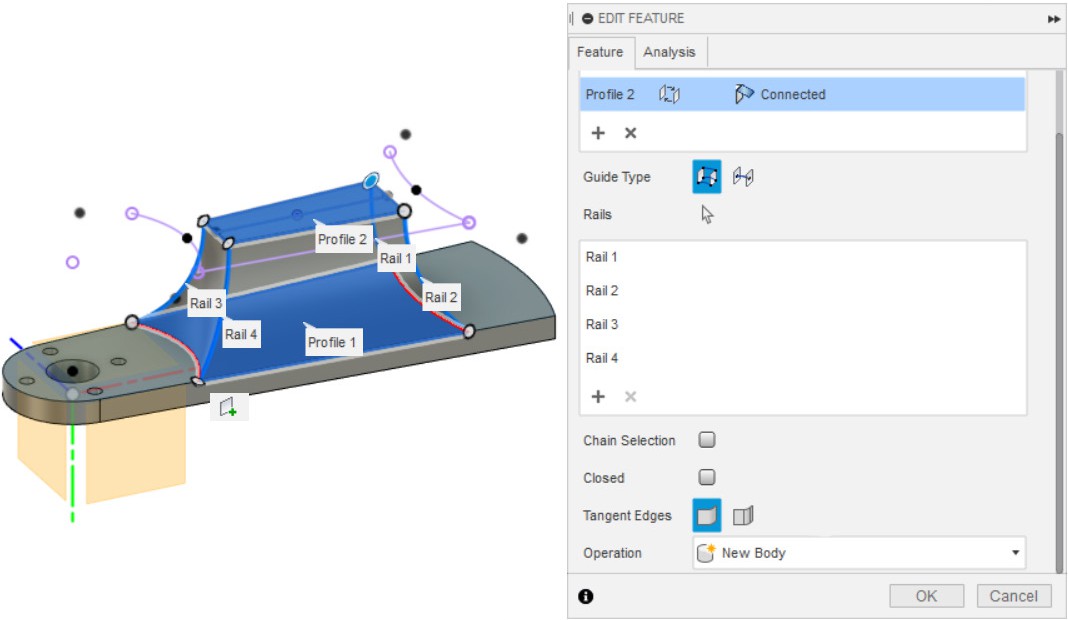 - Делаем LOFT с созданием нового тела и указанием всех четырёх направляющих (пункт 8).