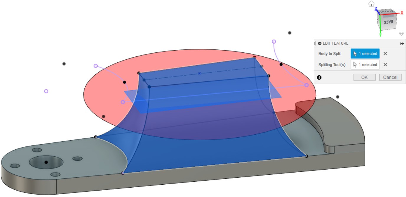 - Разрезаем модель инструментом split body, в качестве тела используем тело, созданное в пункте 9, в качестве инструмента разреза используем плоскость из пункта 12.