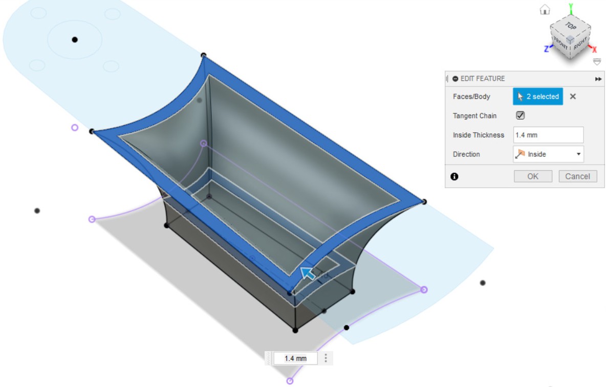 - Применяем инструмент shell для создания оболочки из тела, получившееся в результате выполнения пунктов 9 и 13, выбрав верхнюю и нижнюю плоскость в качестве исключения, чтобы получилось как на рисунке, толщина оболочки 1.4 мм.