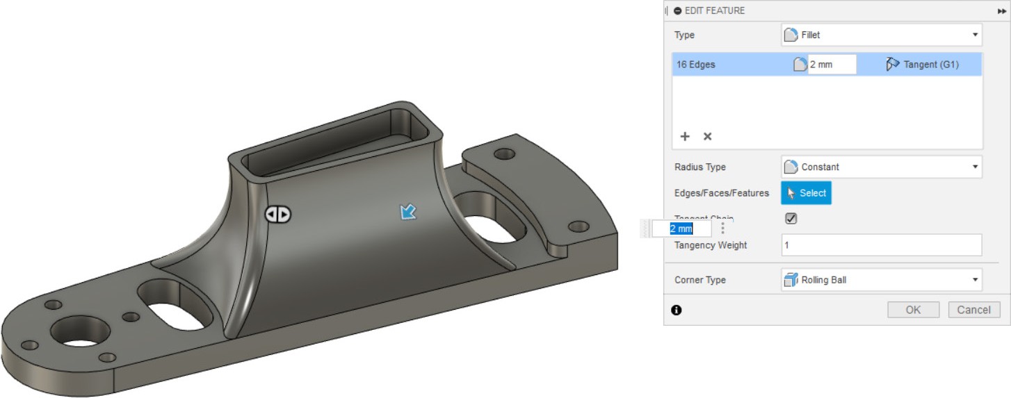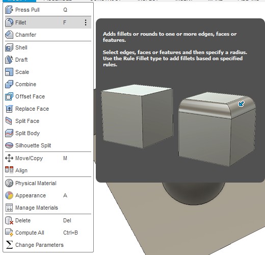 Можно пользоваться операциями дополнительного изменения во вкладке MODIFY. Например, выбрав команду «Fillet», можно скруглить все ребра (необходимо последовательно кликнуть на скругляемые ребра, а также задать радиус скругления).