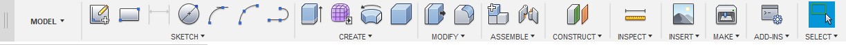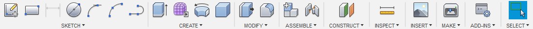 Панель команд разделена на несколько вкладок, таких как: SKETCH, CREATE, MODIFY, ASSEMBLE и т.д. С помощью команд в этих вкладках можно управлять созданием модели на различных этапах. Чтобы открыть полный список команд, нужно нажать на название соответствующей панели. Также можно выносить некоторые часто используемые команды в быстрый доступ.