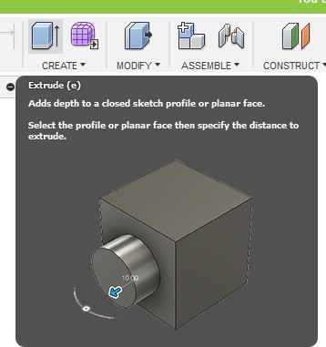 Чтобы из этого эскиза получился куб, эскизу необходимо придать объем. Делается это с помощью команды «Extrude» **на панели «CREATE».