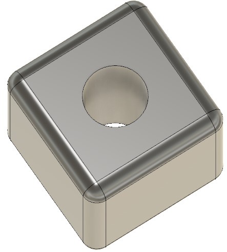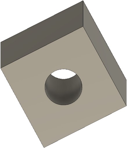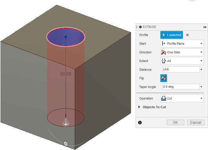 Обратим внимание, что Operation автоматически меняется на Cut (вырезать). Если этого не произошло, можно параметр изменить вручную. В результате, получаем куб со сквозным отверстием на одной из граней. Также следует обратить внимание, что можно было сразу на этапе создания эскиза квадрата учесть отверстие, нарисовав его на том же эскизе, а затем во время операции вытягивания выбрать контур для выдавливания без круга.