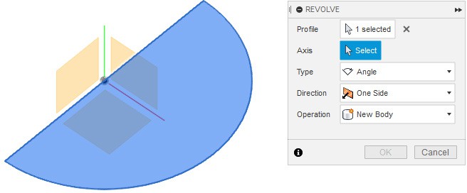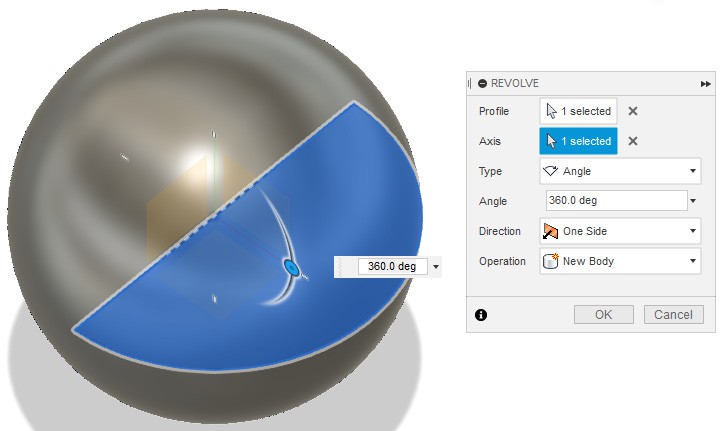 Далее необходимо выйти из режима эскизирования, и выбрать команду «Revolve» из раздела «CREATE». Данная операция является операцией создания объема вращением, поэтому необходимо выбрать вращаемый контур и ось вращения.
