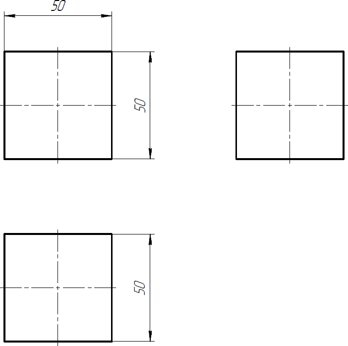 Например, рассмотрим чертеж в трех стандартных видах ранее созданного куба. Выглядеть он будет как 3 квадрата.