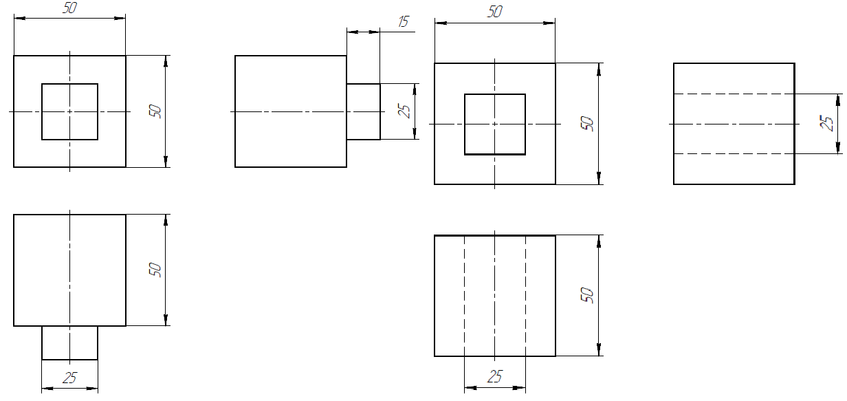 Однако, в случае более сложных деталей – например, куба с вырезом или куба с выступом, необходимо представить уже три вида, поскольку двух будет недостаточно. А по одному из видов вообще можно перепутать 2 детали между собой.