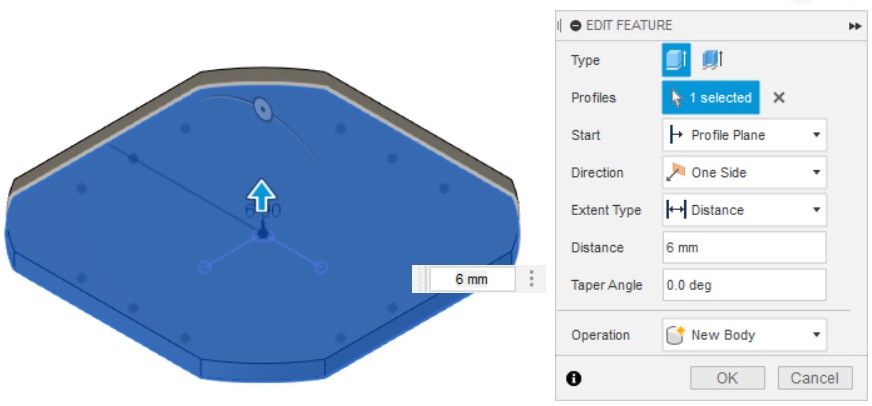 - Вытягиваем эскиз на 6 мм (Extrude), создаём объем.