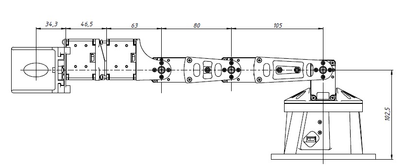 Проведем оценку грузоподъемности робота. В рассматриваемой модели манипулятора применяются сервоприводы DYNAMIXEL XL431- T250-T и сервоприводы AR-S430-01, производимые OOO “Прикладная робототехника”. Их технические характеристики известны. Зная максимальный момент сервопривода, а также длины элементов конструкции модели, можно сделать расчет максимальной массы нагрузки, которую сможет поднять манипулятор.
