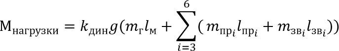 $K_{дин}$ - коэффициент динамики. Расчет производится для статического положения манипулятора, однако требуется учитывать динамические нагрузки. Стандартное значение $K_{дин}$ = 1,4.