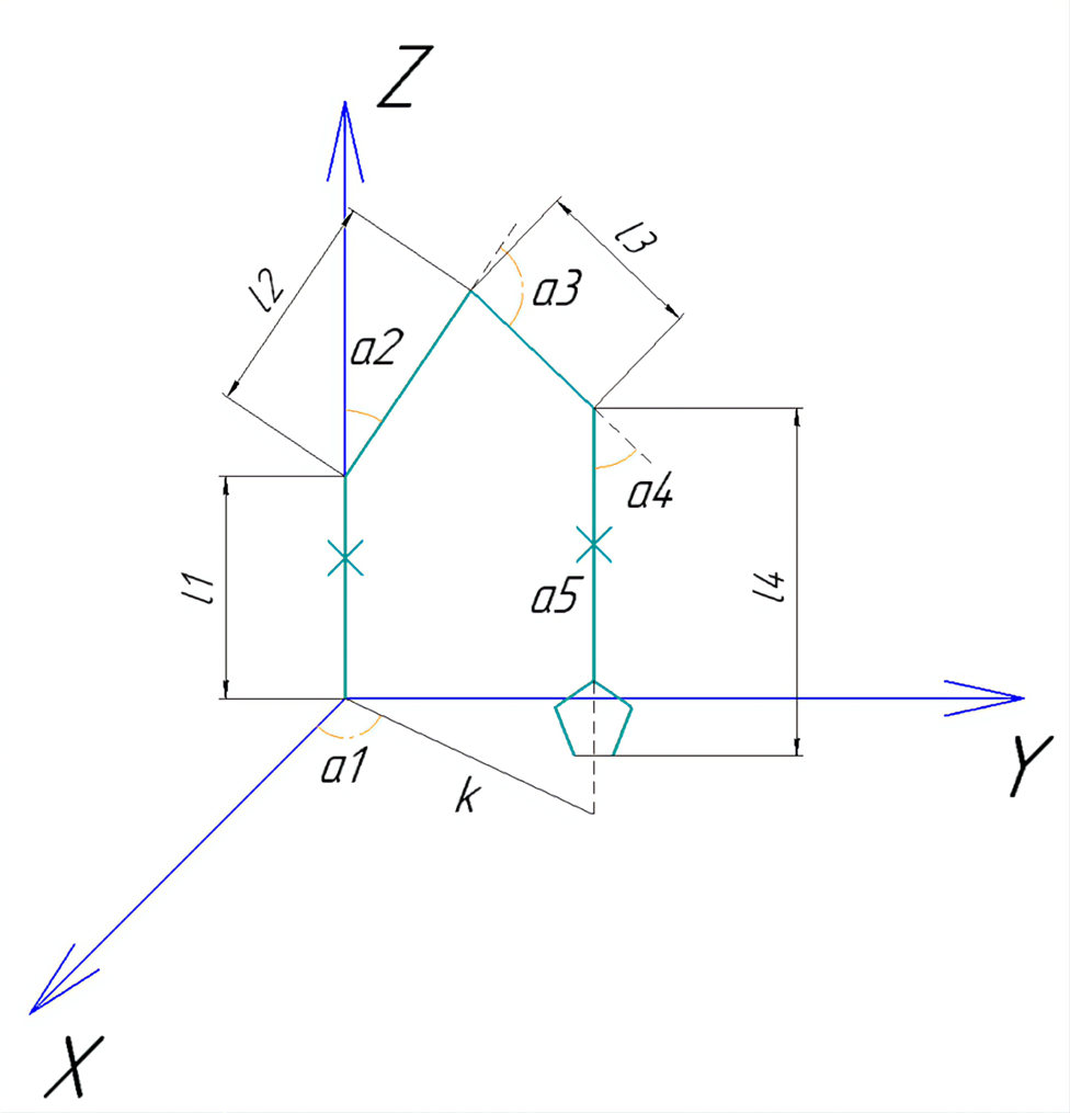 Манипулятор можно условно разделить на 4 линейных сегмента с