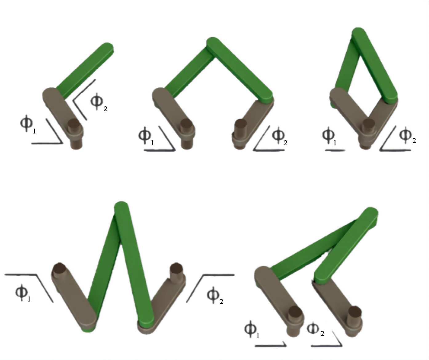 Зеленым цветом показаны звенья манипулятора. Крестиками отмечены продольные степени вращения.