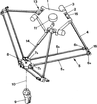 (1) и небольшой подвижной платформы (8), соединённых тремя рычагами. Каждый рычаг состоит из двух частей: верхнее плечо