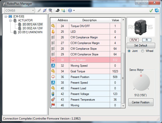 Запустим утилиту PoboPlus Manager. Подключим контроллер к компьютеру с помощью USB кабеля и включим его. Обратите внимание — для работы контроллера необходимо подать на него внешнее питание, либо от аккумулятора, либо от сети. В левом верхнем углу RoboPlus Manager необходимо выбрать COM-порт, под которым контроллер установился в системе и нажать на соседнюю кнопку — Connect. Произойдет подключение утилиты к контроллеру, сопровождающееся звуковым сигналом. В случае, если подключение выполнилось успешно, содержимое окна RoboPlus Manager изменится и в левой части окна можно будет наблюдать подключенные к контроллеру DYNAMIXEL — совместимые устройства, а в центральной — параметры этих устройств. Для настройки сервоприводов необходимо выбрать нужный привод и указать ему в правой стороне окна режим работы — Joint.