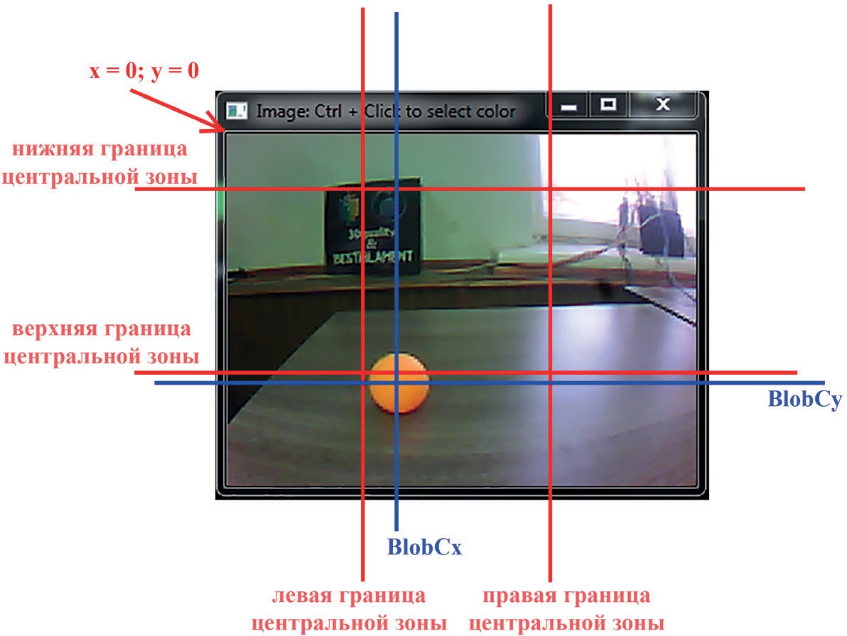 Теперь перейдем к самому алгоритму движения. Поскольку в область видимости камеры попадает сразу несколько объектов, которые можно использовать для определения характера (изгиба) траектории, то можно придумать некий хитрый алгоритм, который будет это учитывать. В нашем же примере для навигации мы будем использовать только один (ближайший) объект, на который и будет ехать робот. Поскольку мы всегда может получить его центр (с помощью переменной blob[i].cx, то при движении будем проверять нахождение центра этого объекта в определенных рамках. Для удобства разобьем область видимости камеры по оси х на 3 равные части и получим границы нашей области — 106 и 213 пикселей.