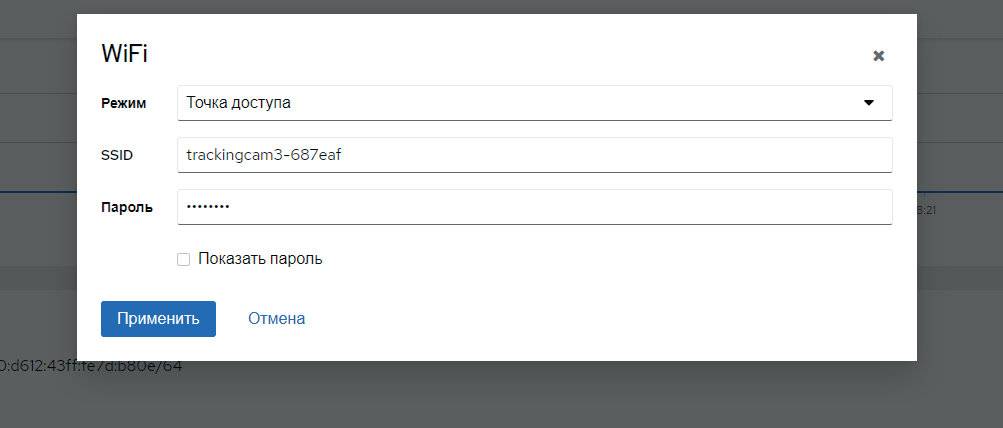 По умолчанию, модуль TrackingCam v3 сам поднимает Wi-Fi соединение в режиме точки доступа, с названием trackingcam3-хххххх и паролем