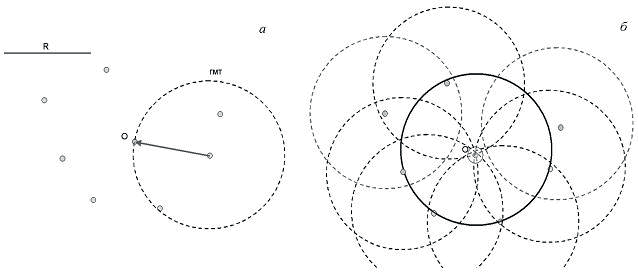 Рассмотрим теперь, как эта идея может быть модифицирована для работы с реальными данными на изображениях, когда требуется найти тот или иной геометрический примитив, за- данный аналитическим уравнением, и при этом, на изображении имеется не две и не три, а значительное количество голосующих точек. На рис. 1.11 показано решение задачи обнаружения окружности известного радиуса в бинарном точечном множестве, в котором могут присутствовать и «ложные» точки (Рис. 1.11, а). Очевидно, что набор центров всех возможных окружностей радиуса R, проходящих через каждую конкретную точку, образует окружность радиуса R вокруг этой точки. Таким образом, геометрическое место точек, которые могли бы быть центрами окружности данного размера, проходящей через эту точку, представляет собой окружность такого же размера с центром в голосующей точке. Наилучшее решение относительно положения центра «наиболее вероятной» присутствующей в данном точечном множестве окружности соответствует точке пересечения максимального числа голосующих окружностей (на Рис. 1.11, б). Точка - «Победитель голосования» помечена большим кружком, а соответствующая ей окружность сплошным контуром).