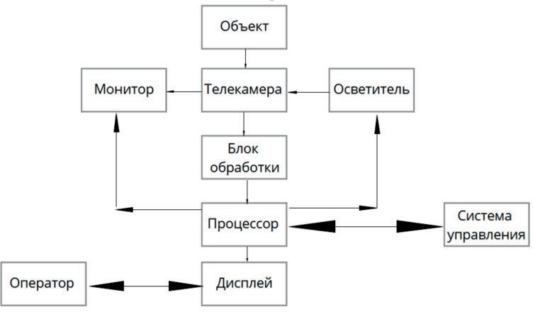 Одним из наиболее распространенных решений, используемых при решении задач технического зрения, является однопроцессорная (одношинная) структура СТЗ (Рис. 1.4), построенная на базе персонального компьютера, выступающего в роли вычислительного модуля. В целях уменьшения времени на пересылочные операции из памяти в процессор и обратно, потоки информации разделяют. Т.е. создают многомашинные и многопроцессорные структуры, способные обрабатывать большие потоки видеоданных, поступающих как с одной, так и с нескольких телекамер. Помимо аппаратной части, в СТЗ не менее важной и сложной частью является соответствующее программное обеспечение, необходимое для ввода и обработки визуальных данных. Современные программные средства в этой области можно разделить на 3 группы: