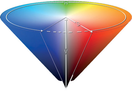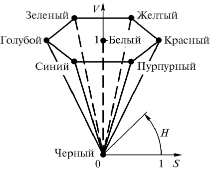 Рис. 1.6. Геометрическая интерпретация цветовой модели HSV: