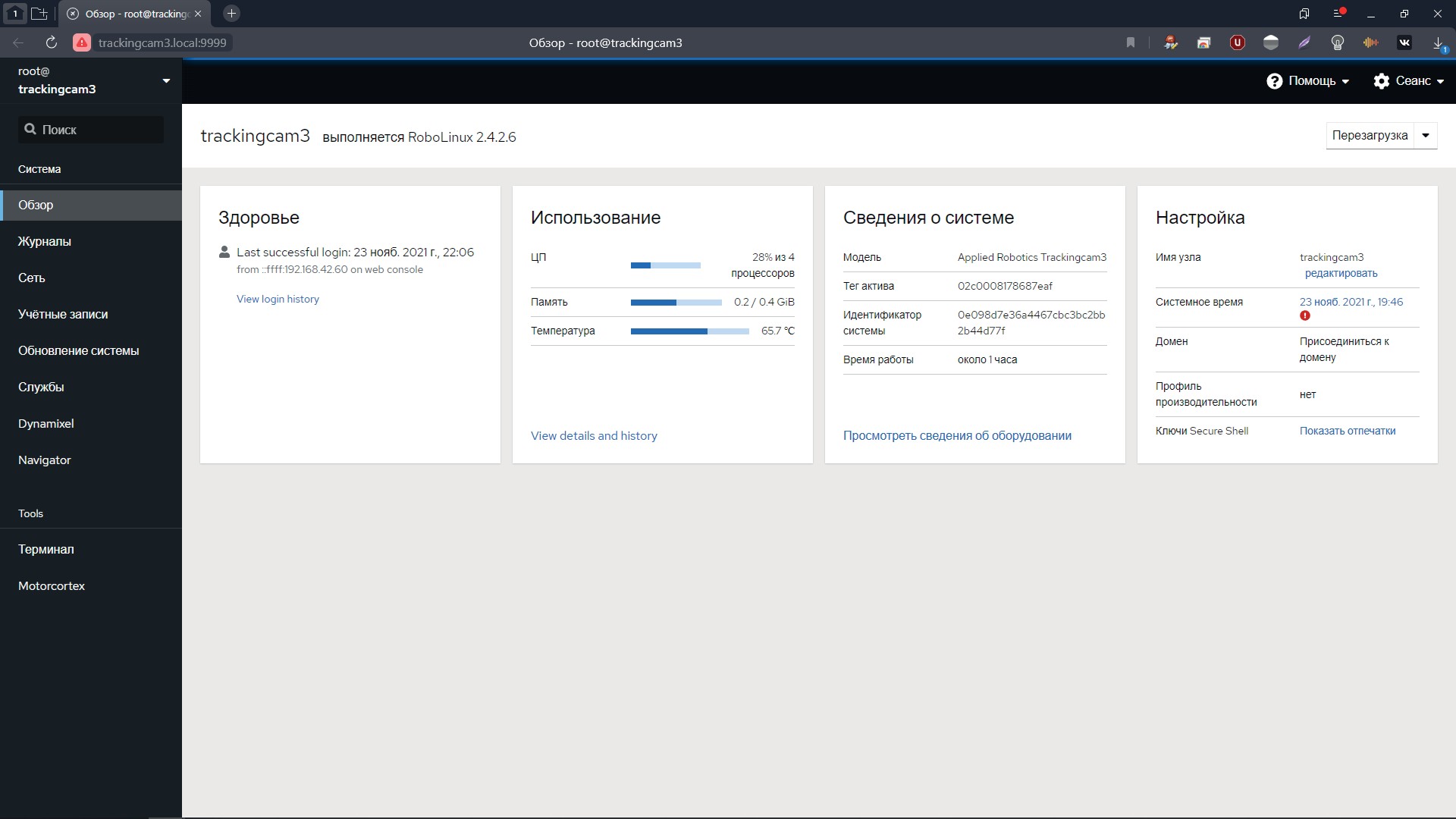 - Перейдя по адресу http://trackingcam3.local:9999 и используя связку логин/пароль: root/12345, зайти в окно администрирования модуля (Рис. 3.4)