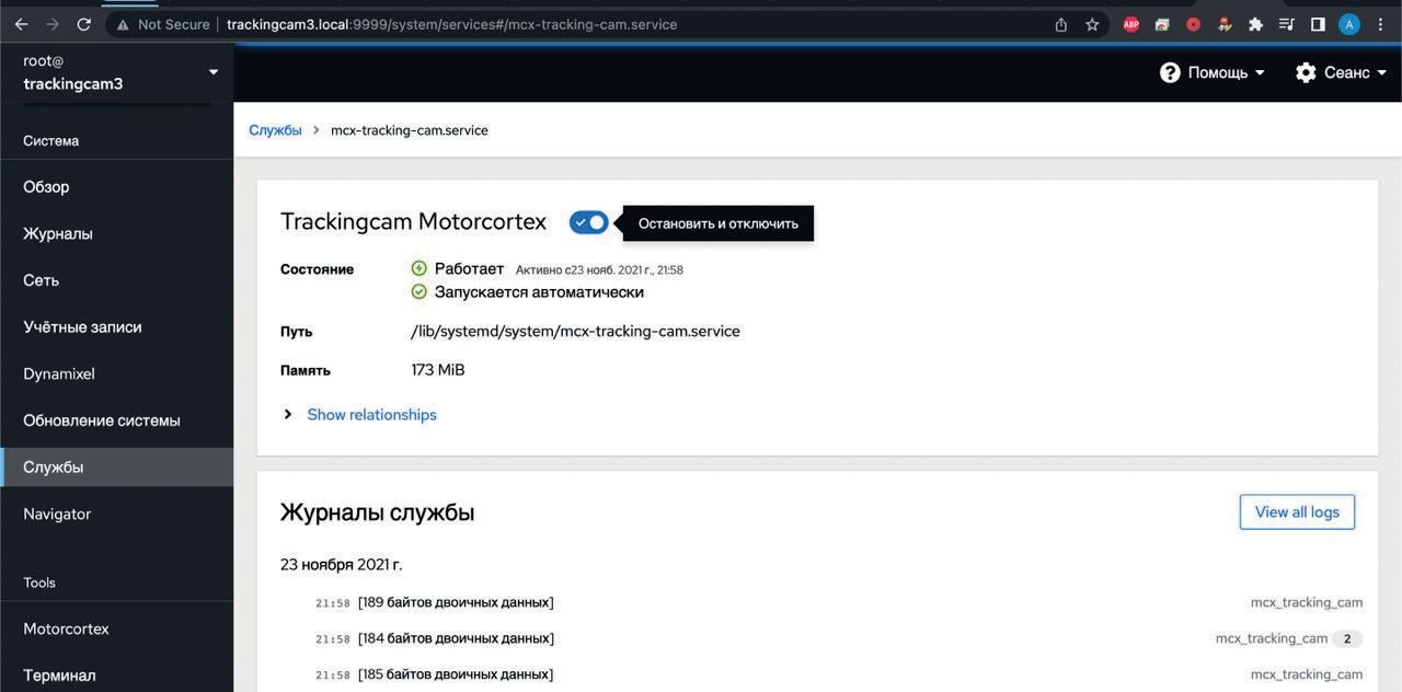 - Перейти во вкладу «Службы», выбрать «mcx-tracking-cam» и нажать на ползунок «Остановить и отключить» (Рис. 3.6). Спустя несколько секунд индикатор состояния изменит свое значение на «Остановлено».