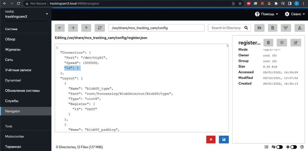 - После остановки службы необходимо перейти во вкладку Navigator, где необходимо открыть файл по следующему пути: /usr/share/mcx_ tracking_cam/config/register.json (Рис. 3.7)