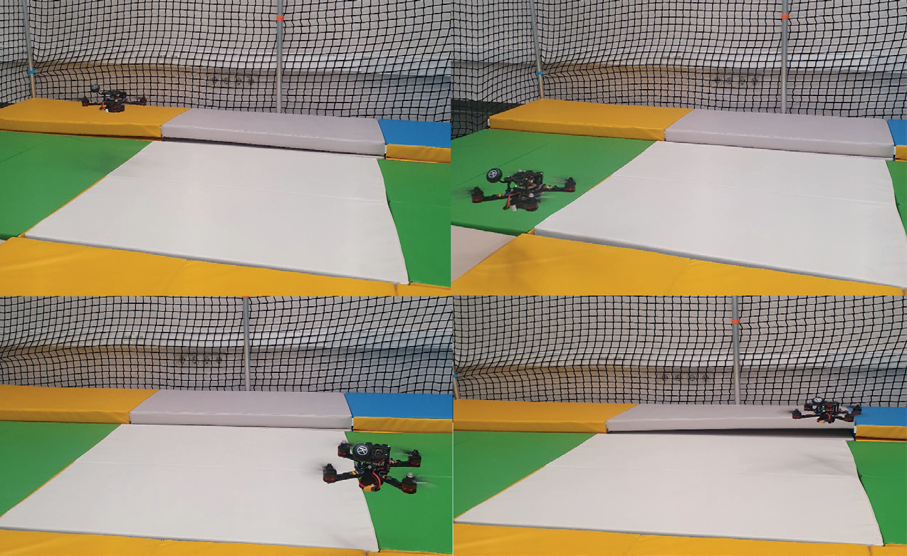 Перед препятствием резко сбрасываем скорость, переместив стик Pitch в центр или назад. Не отпускаем стик Throttle. Высоту продолжаем регулировать стиком Throttle. Повторяем те же действия, совершая полет в обратном направлении. Для этого разгоняем дрон, подав стик Pitch назад, а перед препятствием резко сбрасываем скорость, переместив стик Pitch в центр или вперед. Высоту всё так же продолжаем регулировать стиком Throttle. Для посадки устанавливаем стики Roll, Pitch, Yaw в центральное положение, опускаем стик Throttle . Когда дрон достигнет земли переводим в состояние DISARMED, переключаем стик на пульте, отвечающий за ARM, или нажимаем на соответствующую клавишу, винты прекращают вращаться.