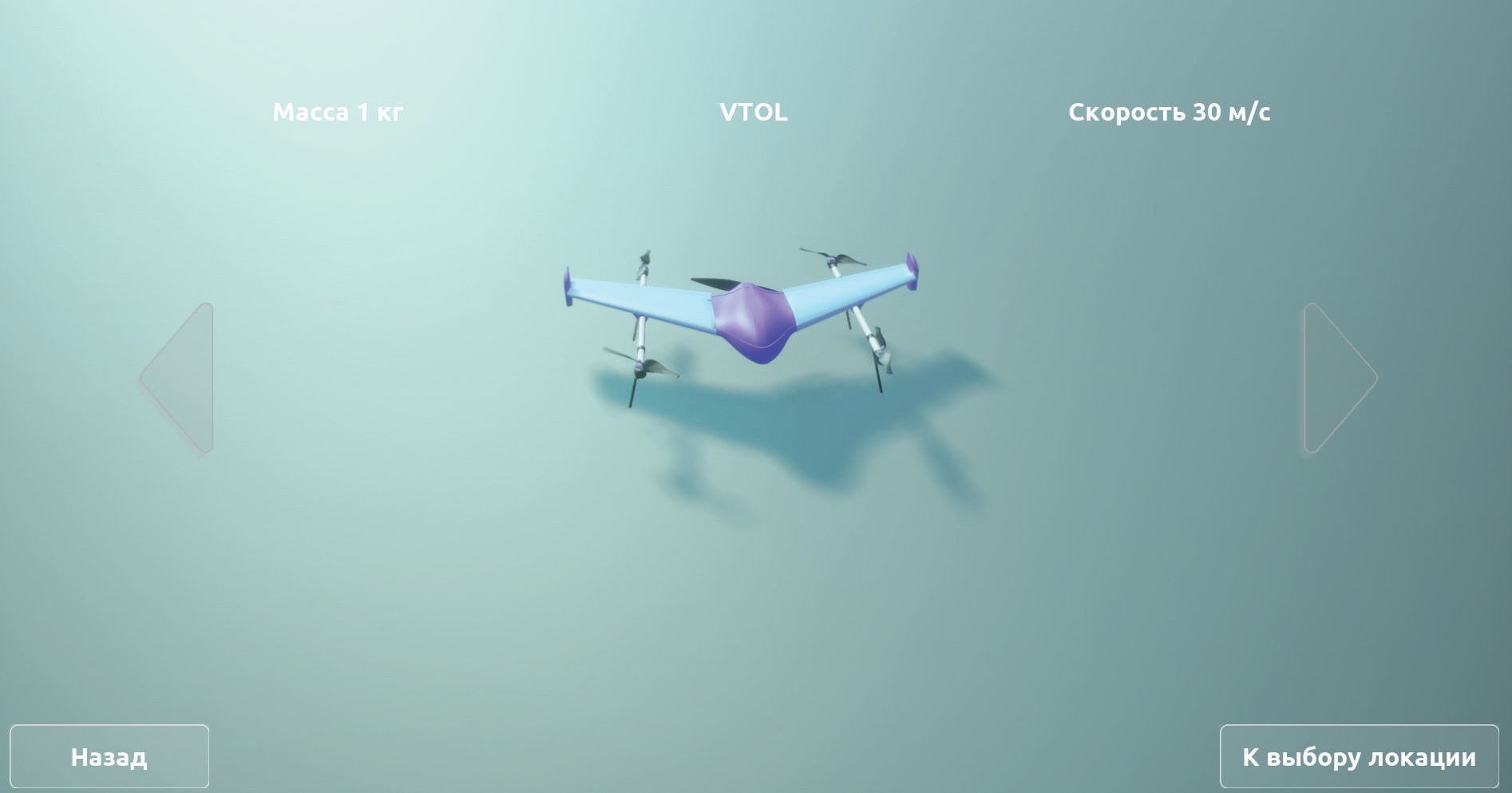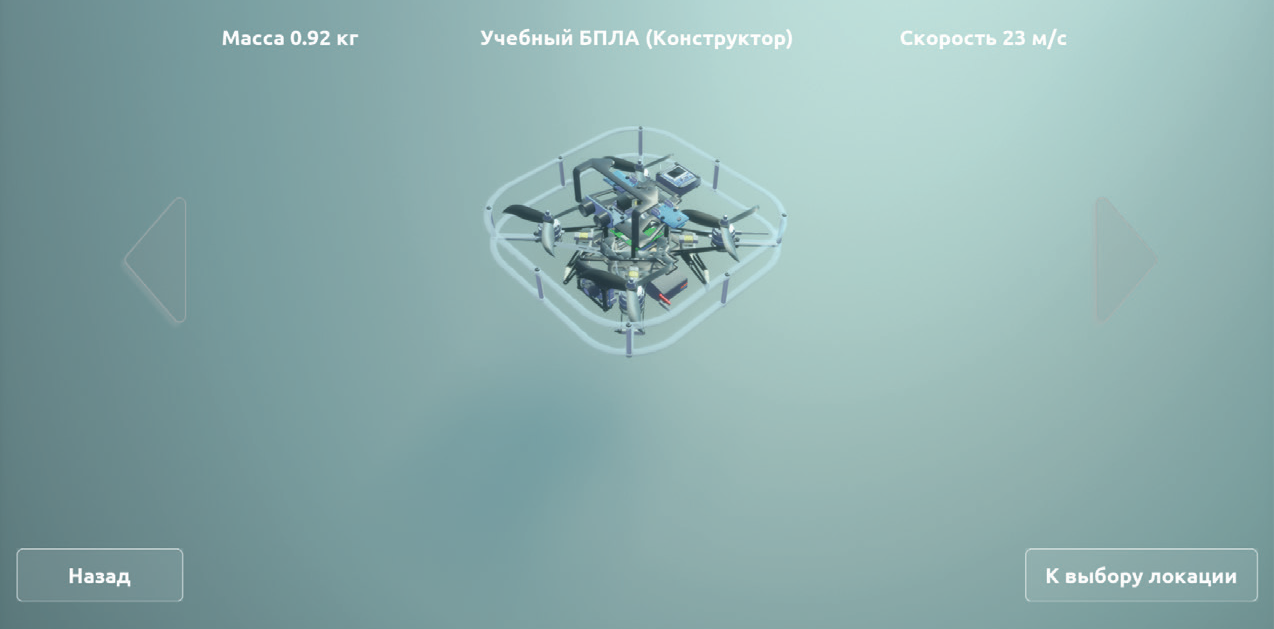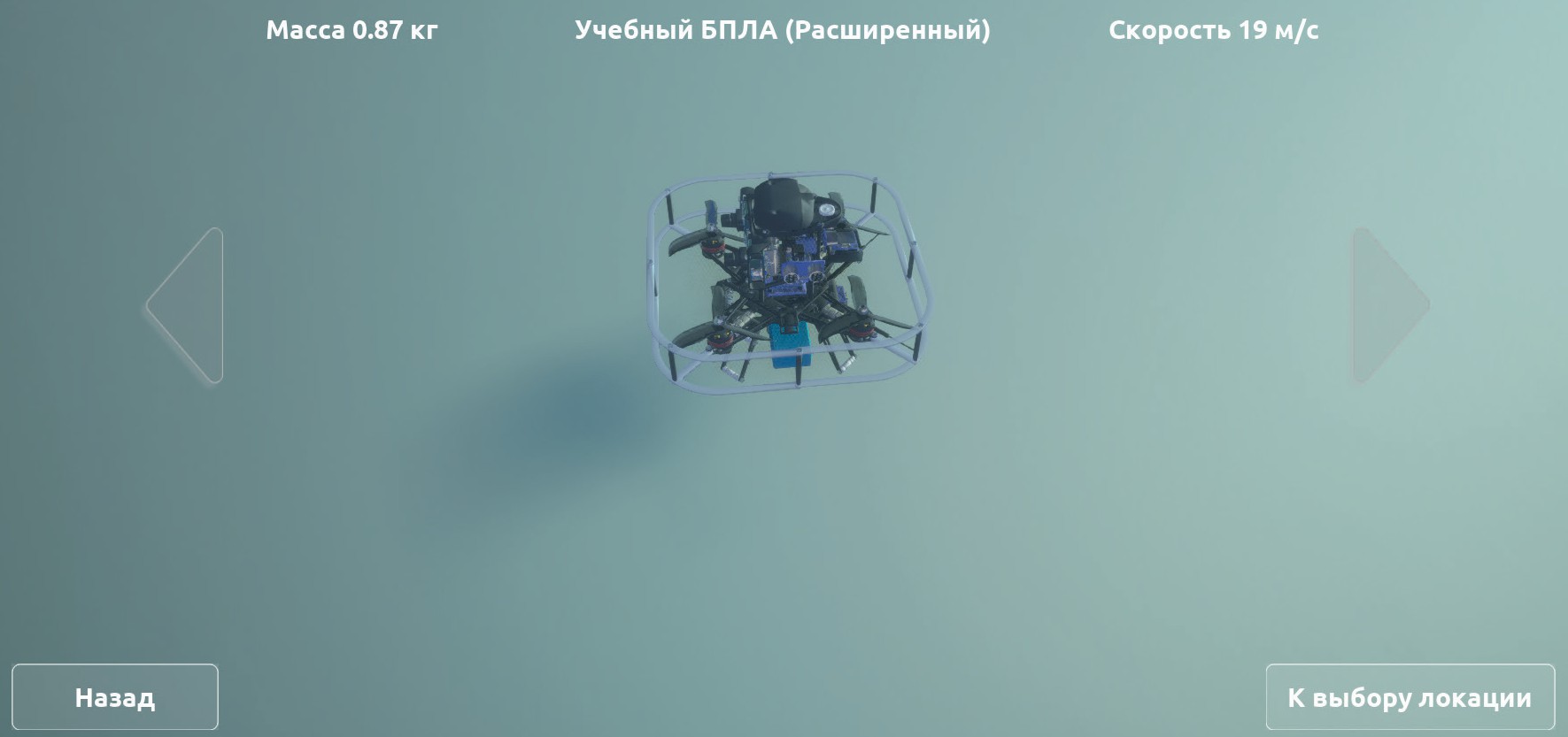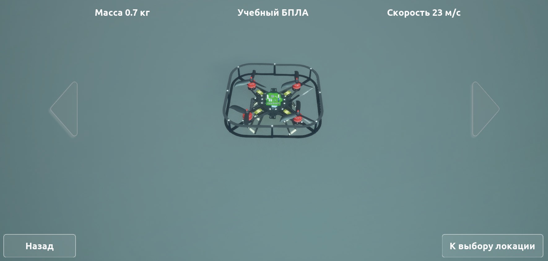 После выбора режима полета, требуется сделать выбор дрона. В симуляторе доступны квадрокоптеры как для образовательных целей и решения образовательных задач, так и более серьёзные виды, направленные на решение сложных и профильных задач: