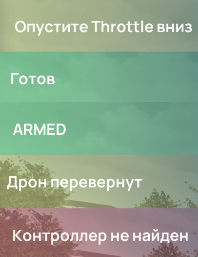 В верхней части отображается информация о режиме полета. В левом верхнем углу выводится информация о пульте, состоянии стиков и о состоянии дрона.