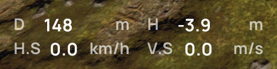 В нижней части располагается информация о расстоянии от места старта (D), высота относительно точки старта (H), горизонтальная скорость (H.S.) и вертикальная скорость (V.S.).