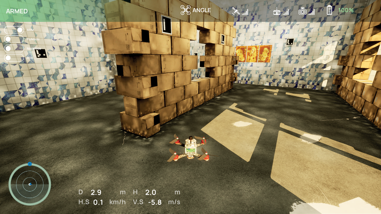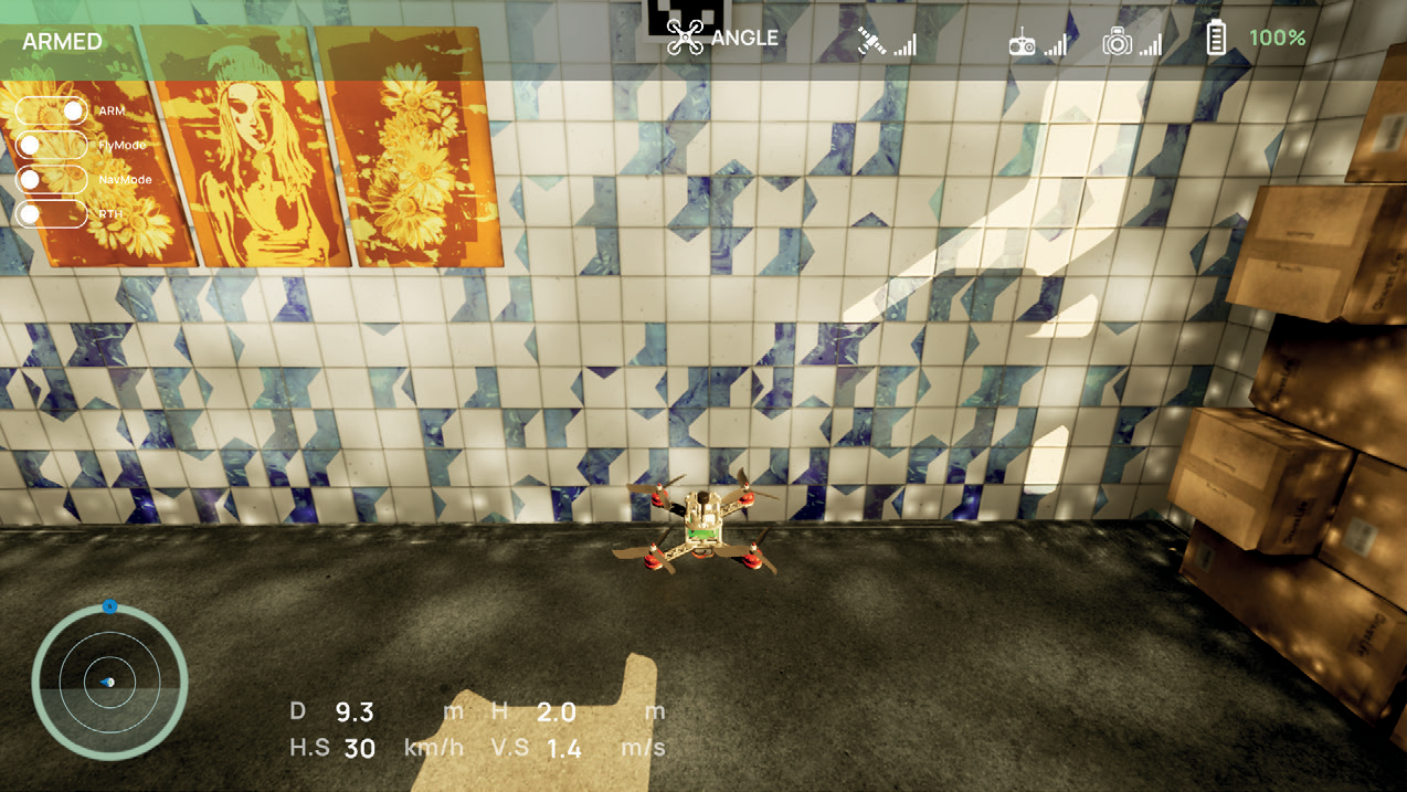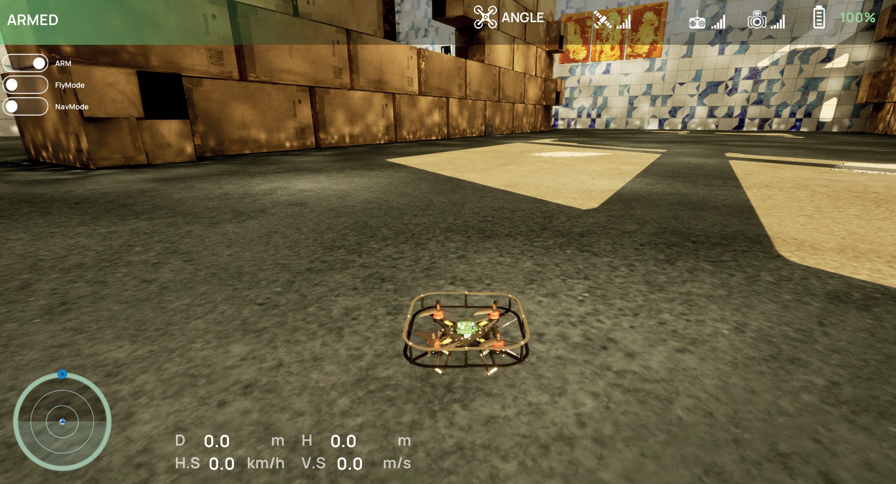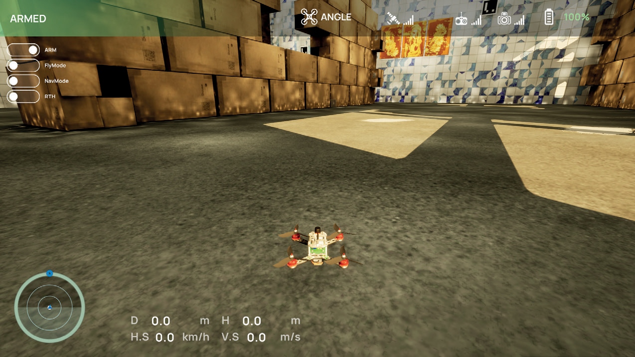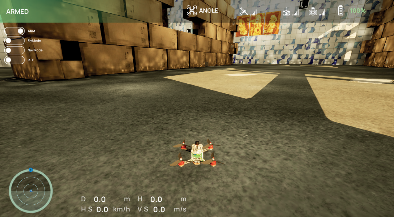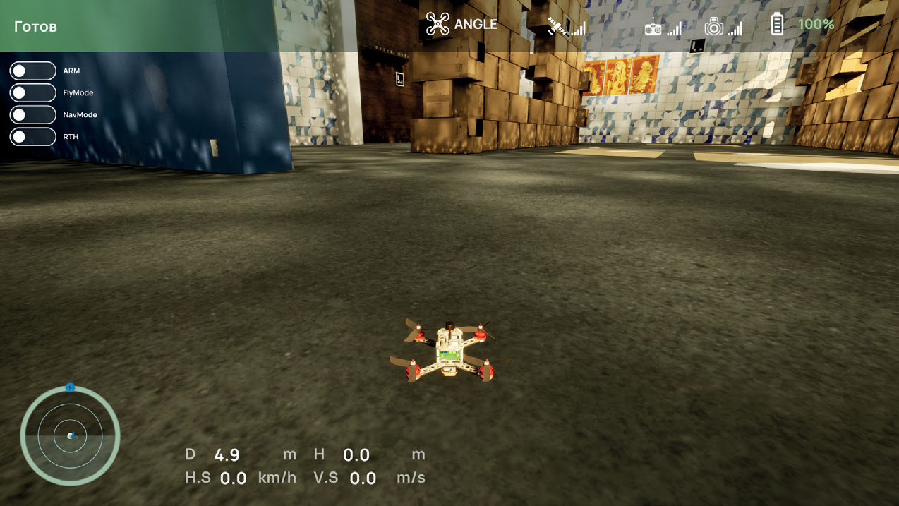 После того как зашли в среду симуляции убедимся, что пульт подключен. Опускаем на пульте Throttle вниз, деактивируем все кнопки, переключатели. Переводим дрон в состояние ARMED, активировав переключатель, закрепленный за каналом ARM, или нажав на соответствующую клавишу.