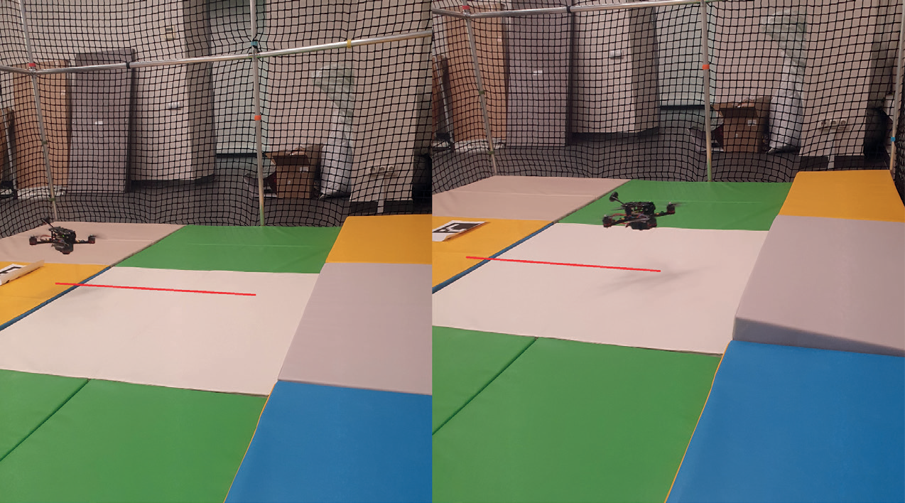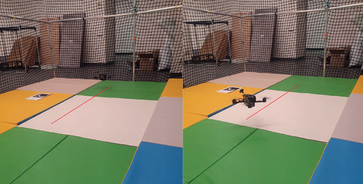 - Смотря вперед через FPV очки, выравниваем квадрокоптер по линии. Используем стики управления для точной настройки положения.