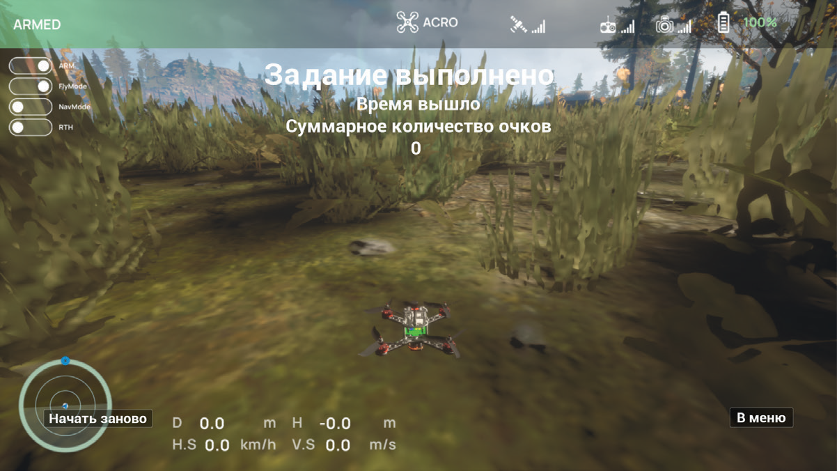 - Концентрация и внимание: Уроки FPV гонок требуют высокого уровня концентрации и внимания. Пилот должен должны быть в состоянии сосредоточиться на задаче и сохранять бдительность на протяжении всего полета. Таким образом, миссия «FPV гонка (сложная)» поможет пилотам развивать не только технические, но и физические, и ментальные навыки. По завершении данного урока можно повторить миссию, нажав на кнопку «Начать заново», или выйти в «Главное меню», нажав «В меню»
