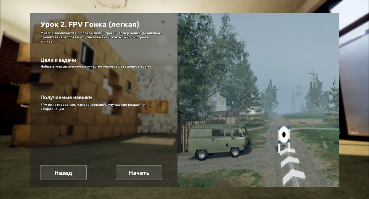 - Концентрация и внимание: Уроки FPV гонок требуют высокого уровня концентрации и внимания. Пилот должен быть в состоянии сосредоточиться на задаче и сохранять бдительность на протяжении всего полета. Таким образом, миссия «FPV гонка (легкая)» поможет пилотам развивать не только технические, но и физические, и ментальные навыки. По завершении данного урока можно повторить миссию, нажав на кнопку «Начать заново», или выйти в «Главное меню», нажав «В меню»